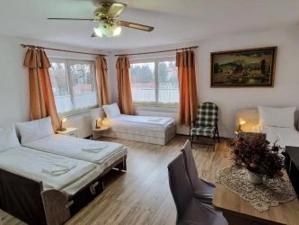 - Camera nr. 3 și 4: cu 6 locuri. Apartament cu hol, si baie comună. O cameră are o canapea și doua paturi twin, cealaltă cameră are 2 paturi twin.